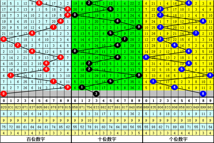 百位号码:连续两期百位出号分别为:7-9,历史上福彩3D连续两期前后分别出号7-9的奖号共出现80次。在百位7-9的奖号现象出现时,近15期下期分别出号:566-853-144-023-356-184-811-567-228-541-214-016-701-734-806;
